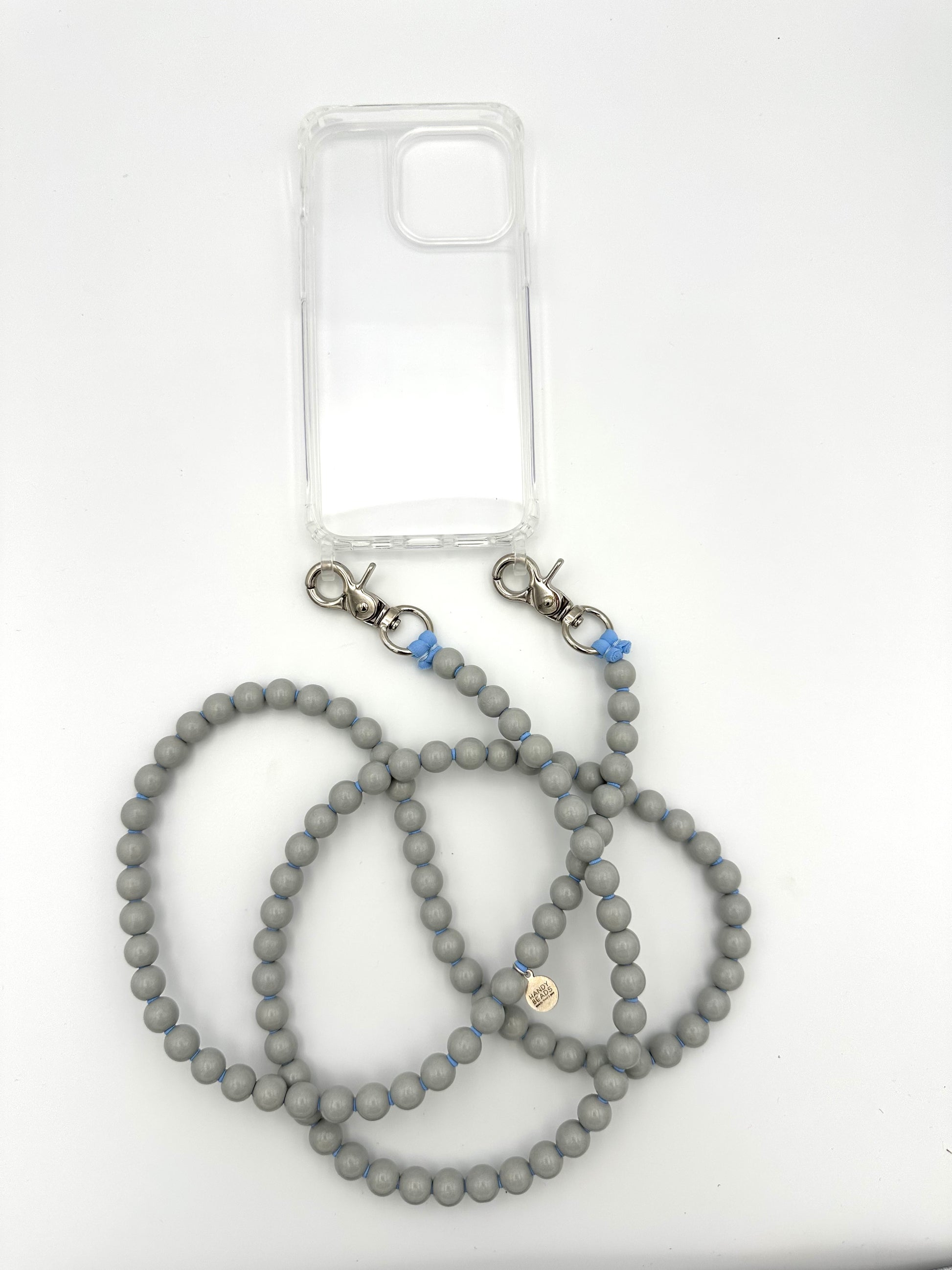Cellphone Chain made of 10mm wooden beads and golden or silver swivel clasps. Beads are grey with a light blue thread.