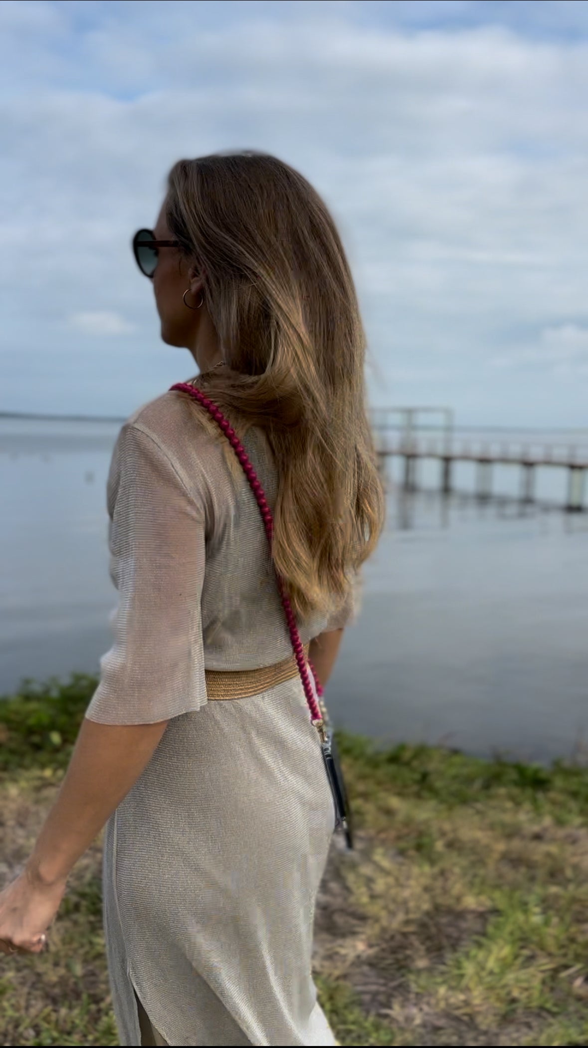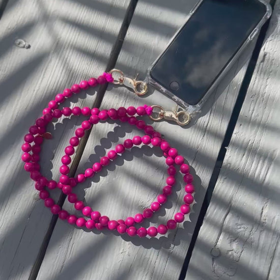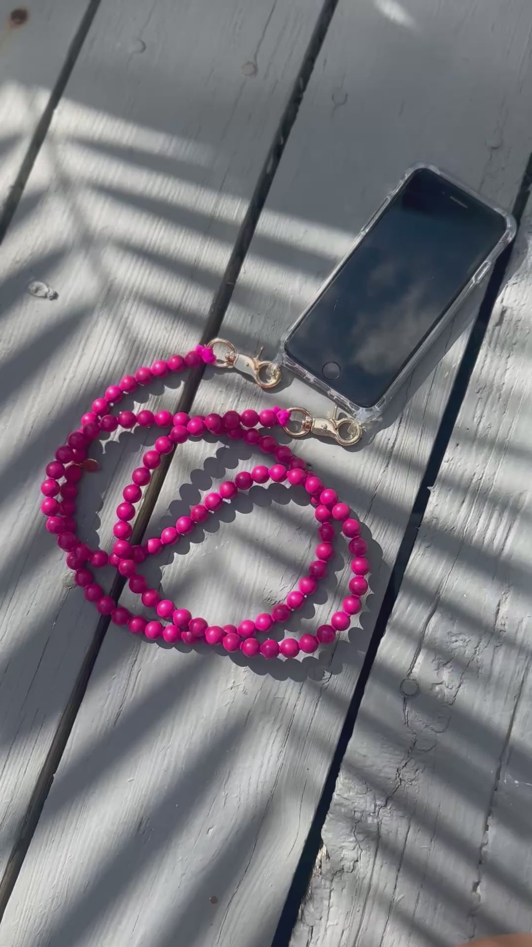 Cellphone Chain made of 10mm wooden beads and golden or silver swivel clasps. Beads are magenta with a magenta thread.